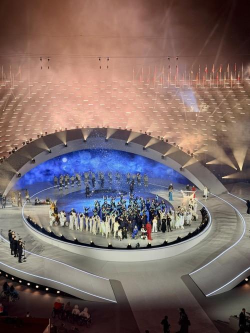开幕式表演最后,策划并成功举办这场典礼的艺术家、表演者、志愿者、创意人员、组织者和技术人员们,再次回到舞台,共同上台合唱意大利著名歌曲《Domenico Modugno的Nel blu dipinto di blu》。米兰-科尔蒂纳冬残奥会组委会全体成员与典礼团队成员共同献上热烈的集体拥抱,彰显了残障人士与多元文化的世界。